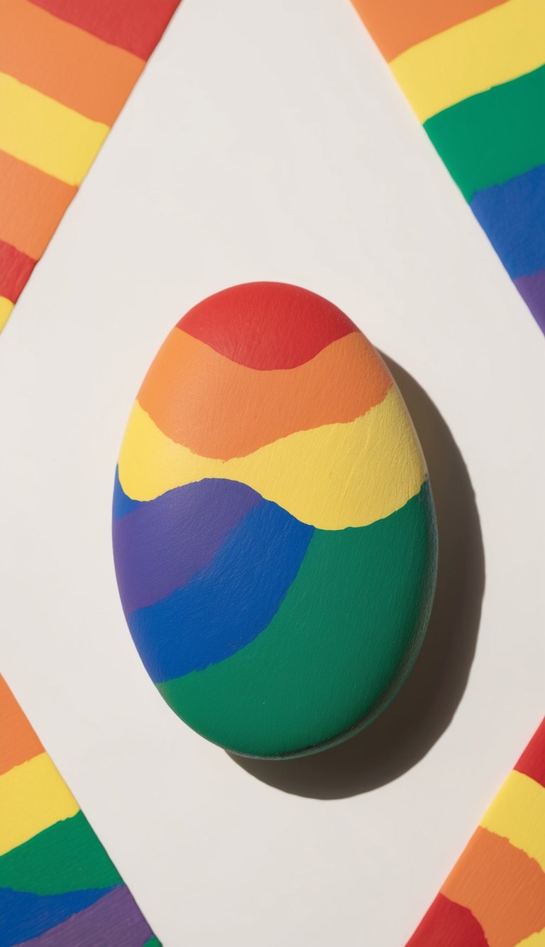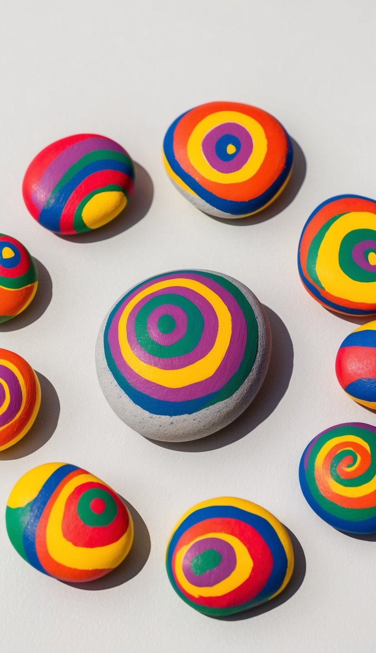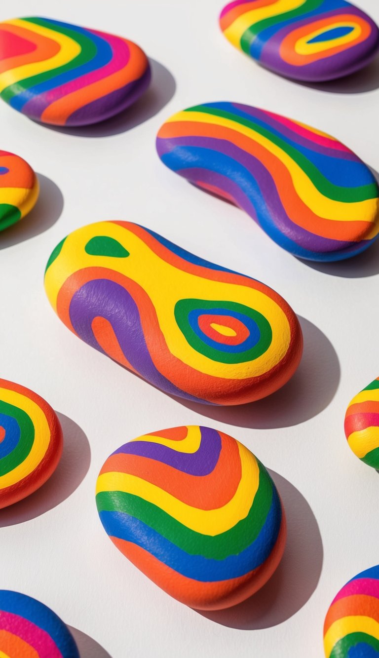 Funky rainbow stripes on painted rocks create eye-catching designs that stand out with their vibrant color patterns and playful energy.