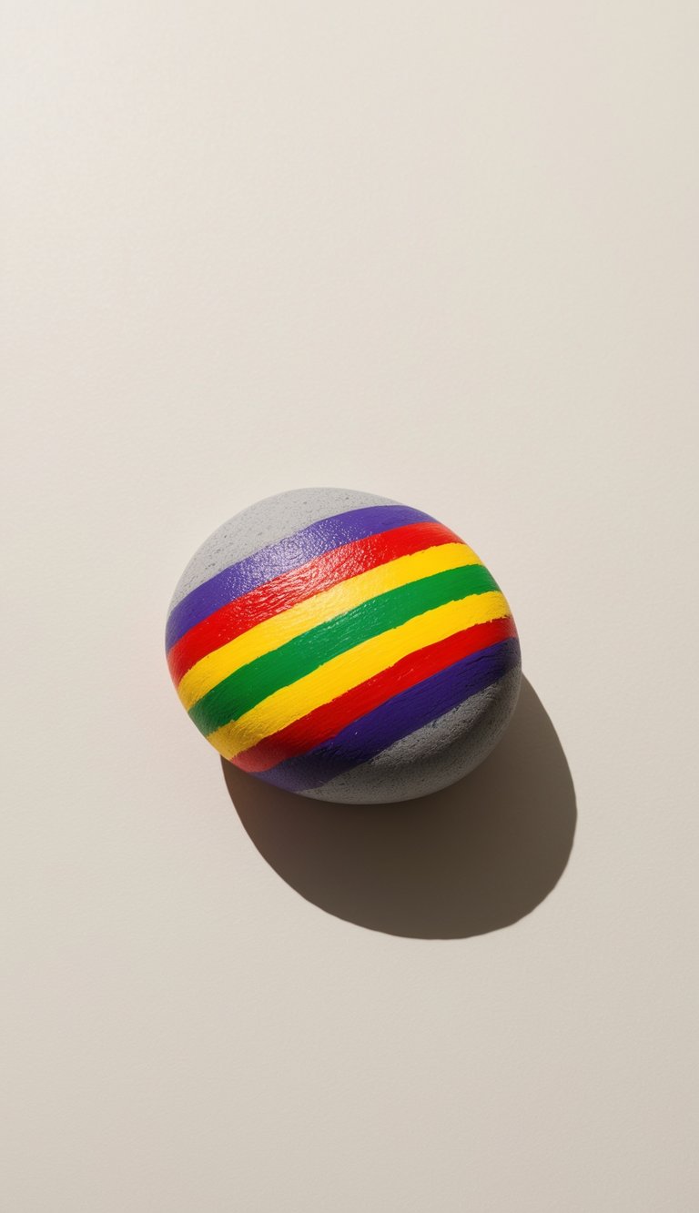 The center rock features a vibrant rainbow design with perfectly arched stripes transitioning from warm reds to cool blues, creating a striking and cheerful focal point. Its smooth, polished surface enhances the vivid colors, making it stand out as the centerpiece of this playful collection.