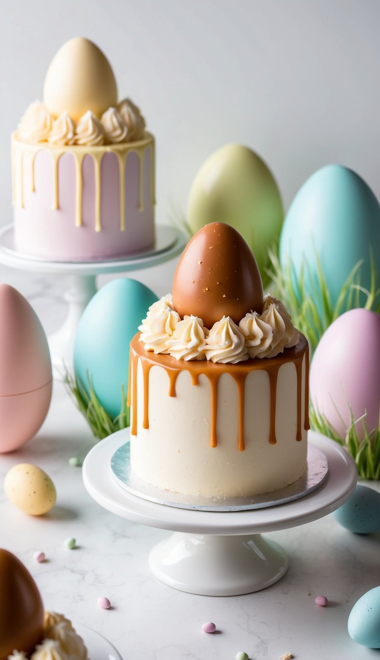 The Salted Caramel Egg Cake is a delightful Easter treat featuring a rich cake decorated with caramel drizzles and edible egg decoration on top.