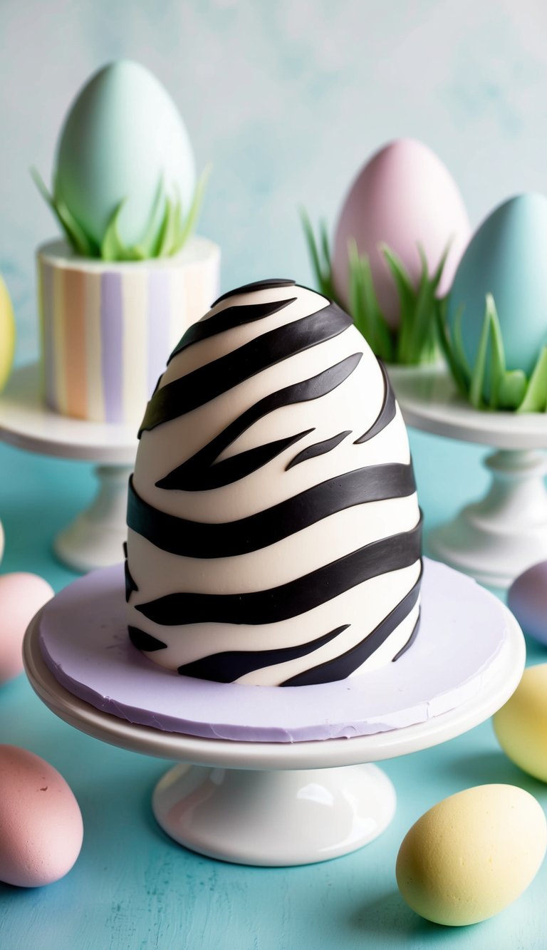 Create a striking Easter egg cake with bold zebra stripes in classic black and white, adding a wild twist to your spring celebration.