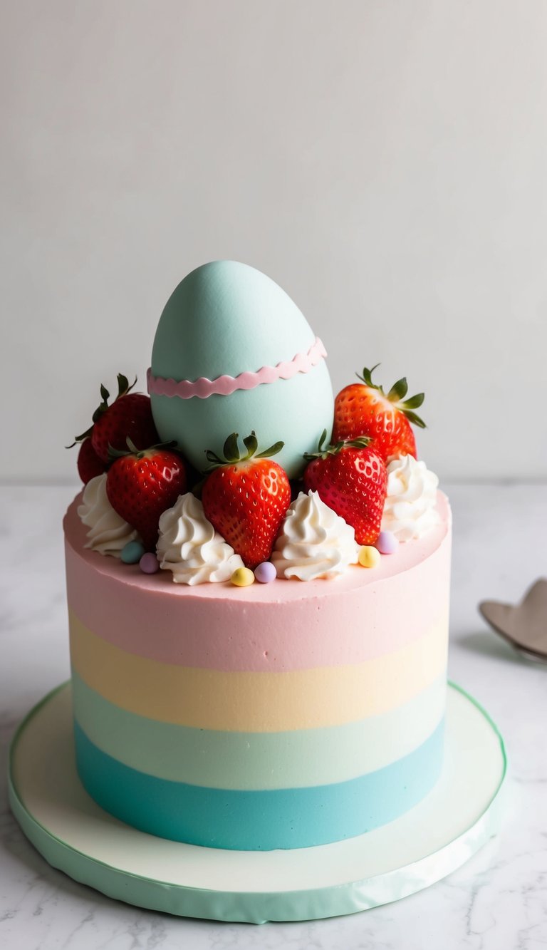 This charming cake features a tall, pink egg-shaped topper layered with strawberry frosting and adorned with a swirl of buttercream and a fresh strawberry.