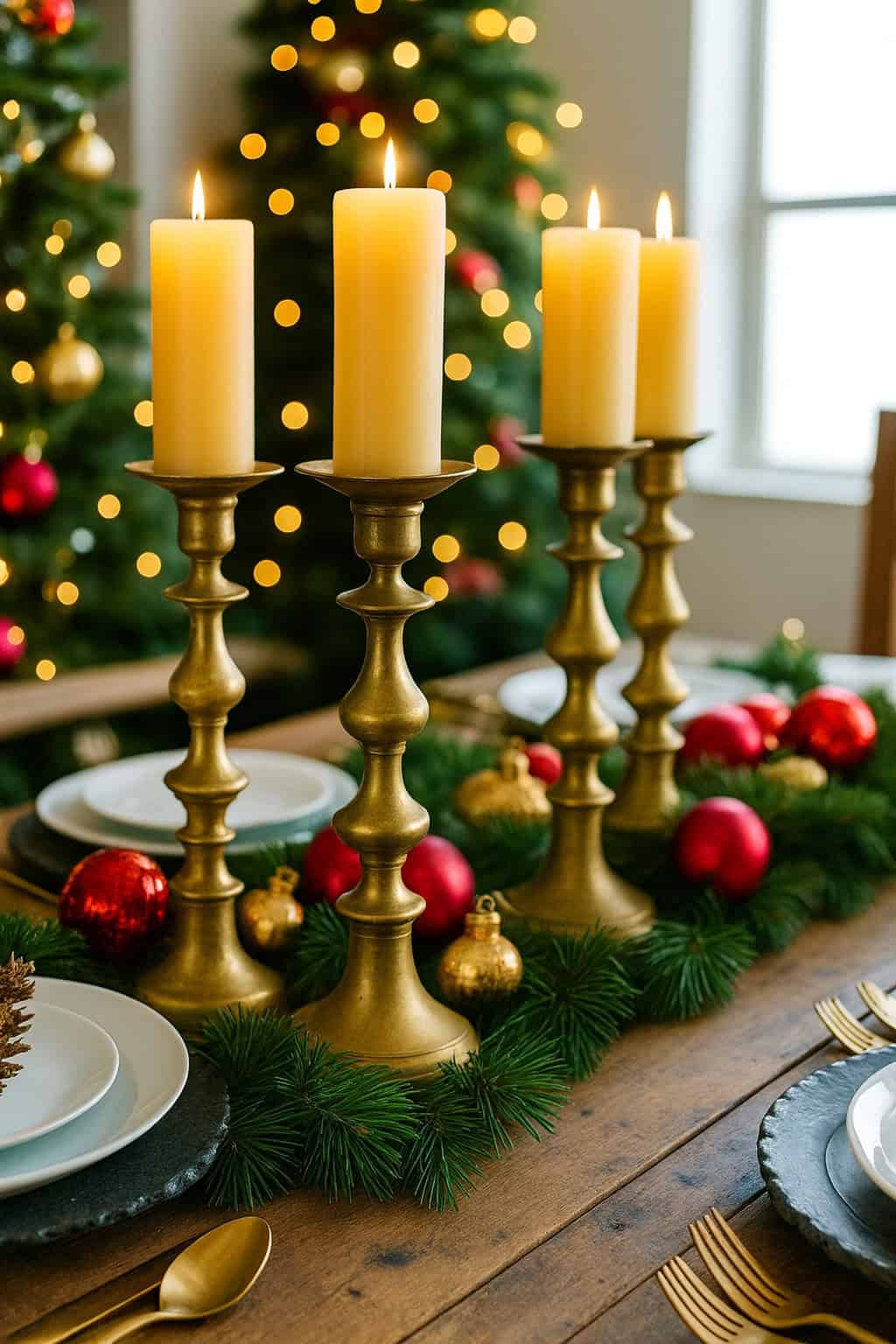 Golden candlesticks bring timeless charm, while evergreen garland and ornaments add a festive farmhouse touch. It’s classic, cozy, and made to impress your holiday guests.