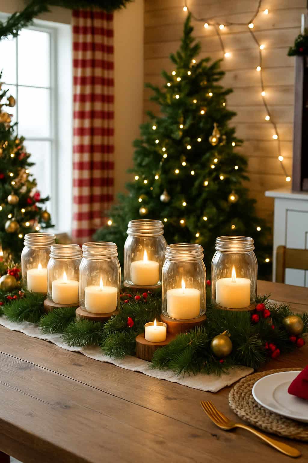 A chunky wooden pillar holds a glowing white candle, adding cozy farmhouse charm. Surrounding greenery, red ornaments, and golden votives bring festive warmth to the rustic place settings.