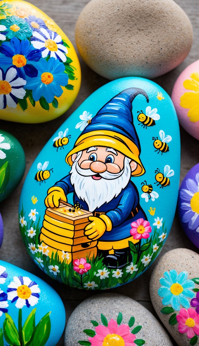 A charming beekeeping gnome painted on a smooth river rock brings whimsical garden decor to life.