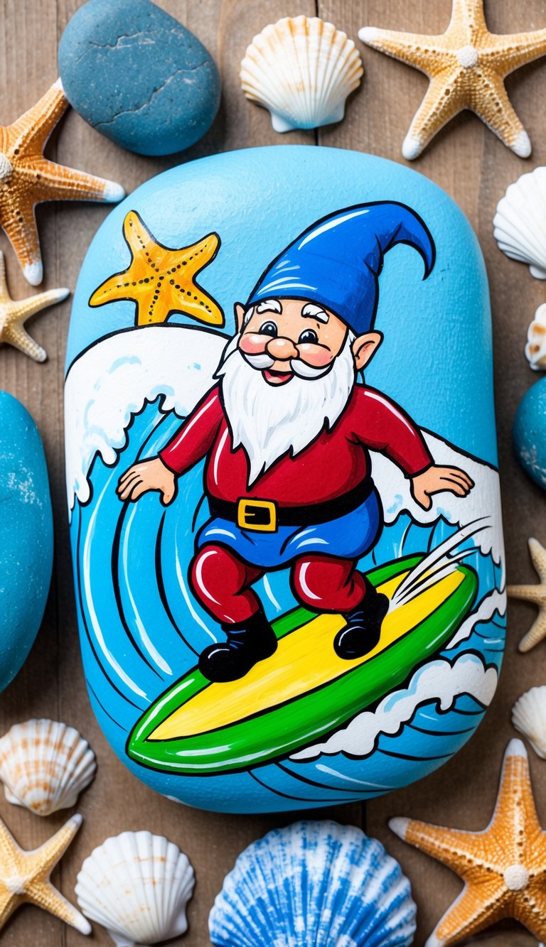 Transform ordinary rocks into adorable beach gnomes with sky-blue hats and sandy feet, surrounded by hand-painted starfish and a tiny sandcastle.