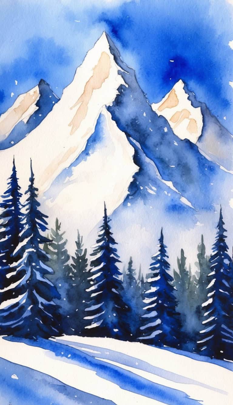 Towering peaks and pine trees painted in cool blues create a peaceful, postcard-perfect winter moment. This watercolor wallpaper brings alpine serenity straight to your iPhone screen.