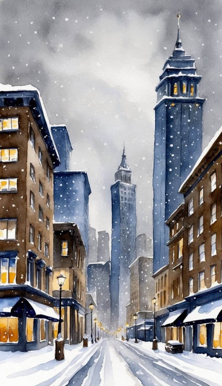 A magical winter wonderland unfolds as snowflakes dust the city skyline, transforming skyscrapers into glittering ice castles. Twinkling lights peek through frosty windows, creating a cozy glow against the crisp white backdrop.