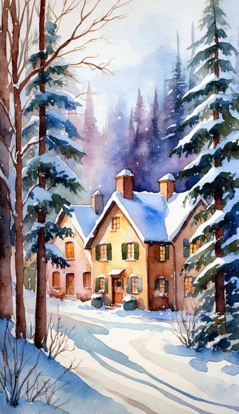 Nestled among snow-draped trees, this charming home glows with warmth and welcome. It’s the perfect scene to turn your screen into a peaceful winter escape.