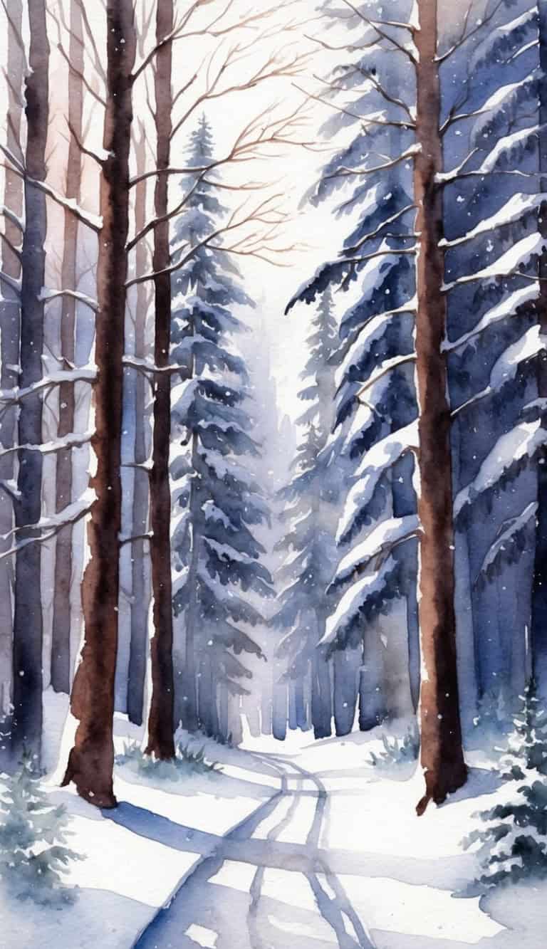 Tall trees line a peaceful, snow-blanketed trail that invites you to wander deeper into the wintery woods. Gentle shadows and falling flakes add a dreamy, magical calm.